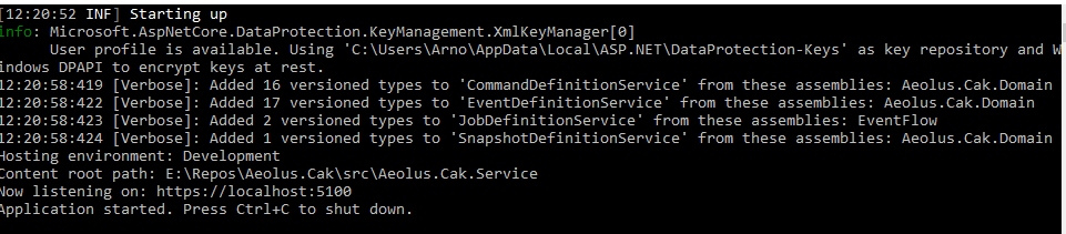 - De service start nu op en geeft aan op welke poort, bijv. https://localhost:5100